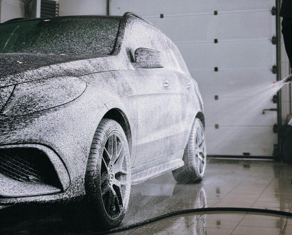 На этапе мойки применяется специальная пена, которая словно «снимает» грязь с поверхности. Она предварительно наносится на кузов и оставляется на несколько минут для лучшего воздействия. После этого мы удаляем пену с помощью мягких губок и тщательно ополаскиваем автомобиль.